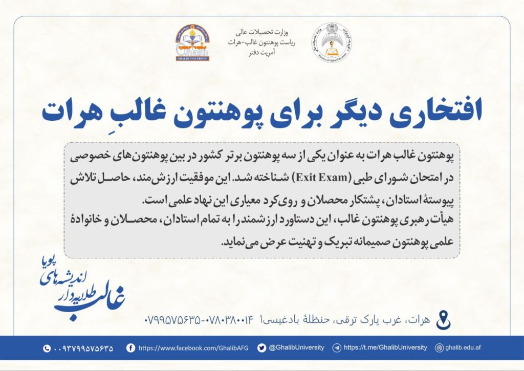 پوهنتونِ غالب هرات به عنوان یکی از سه پوهنتون برتر کشور در بین پوهنتونهای خصوصی در امتحان شورای طبی (Exit Exam) شناخته شد. این موفقیت ارزشمند، حاصل تلاش پیوستهٔ استادان، پُشتکار محصلان و رویکرد معیاری این نهاد علمی است.