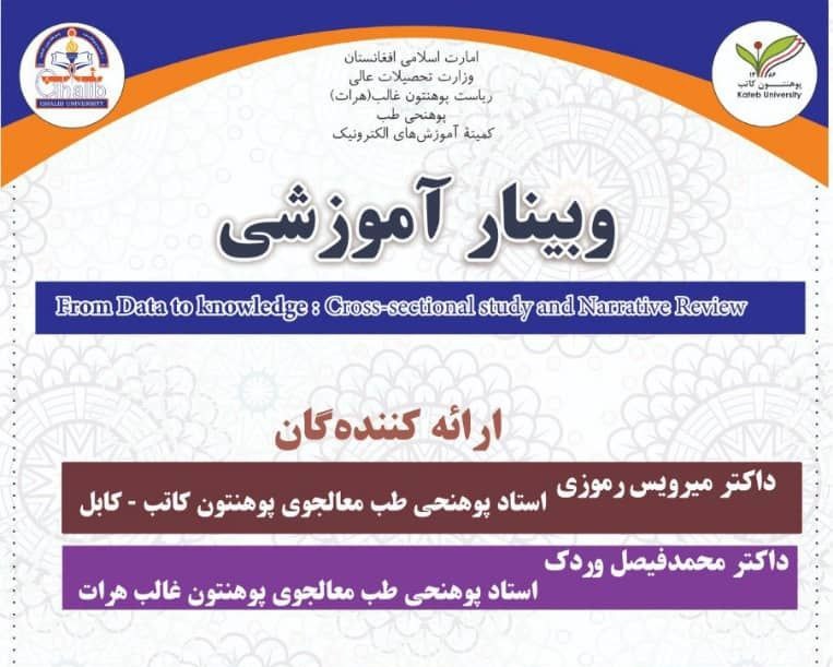 » به همت کمیته فرعی آموزش الکترونیک پوهنحی طب پوهنتون غالب هرات و همکاری پوهنحی مربوطه ، در تاریخ 16 قوس ۱۴۰۴، با ارایه دکتر میرویس رموزی استاد برحال پوهنحی طب پوهنتون کاتب کابل و دکتر محمد فیصل وردک از اساتید پوهنحی طب پوهنتون غالب با حضور داشت ریاست پوهنحی طب، و محصلان طب به صورت آنلاین درسالن جلسات پوهنتون و از طریق گوگل میت به صورت لینک آنلاین آزاد برای سایر اشتراک کنندگان برنامه، که در سالن جلسات حضور نداشتند، برگزار گردیده . محتوای ارائهشده در این نشست، شامل مفاهیم کلیدی، اصول بنیادین و نکات عملی و کاربردی برای مطالعات مقطعی Cross sectional study و مروری Narrative Review و نحوه انجام و کاربردی این نوع مطالعات در ساحه تحقیقات طبی و مونوگراف نویسی محصلین به روش مطالعات مقطعی به صورت کاربردی و اجرایی پرداخته شد.. این برنامه با ارایه دکتر میرویس رموزی و دکتر محمد فیصل وردک و با حضور ریاست پوهنحی طب، اساتید و محصلان در سالن جلسات پوهنتون بهصورت آنلاین و از طریق لینک آزاد گوگل میت اجرا گردید. در جریان وبینار، کاربردهای آموزشی این نوع مطالعات در بهبود کیفیت دانش و تحقیقات طبی و نحوه به کارگیری آن در مراحل مختلف تحقیقات توضیح داده شد . برنامه با استقبال خوب شرکتکنندگان همراه بود و زمینه آشنایی بیشتر محصلان با انواع مطالعات تحقیقاتی همچونCross sectional study و Narrative study را فراهم ساخت.